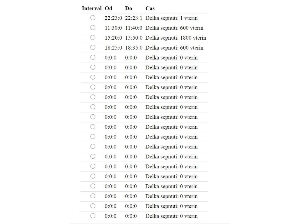 V další sekci se nastavují časové intervaly (1-80). Stiskněte zaklikávací prvek nalevo a vyplňte čas začátku a konce intervalu a stiskněte Uložit změny. Jednomístná čísla uvádějte bez nul, např. 9 hodin, 4 minuty, NIKOLIV 09 hodin a 04 minuty. Ihned po uložení je vložený interval platný. Tlačítkem Vynulovat všechny intervaly smažete celý plán.