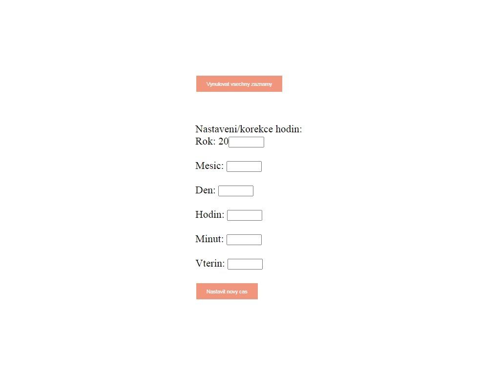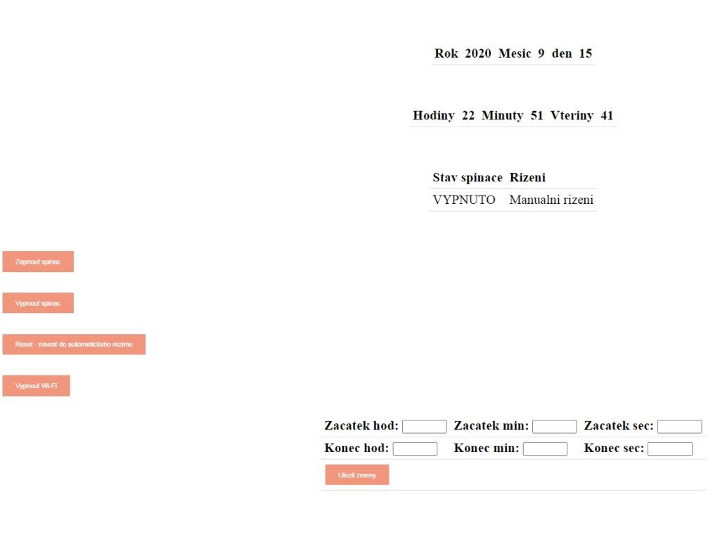Na PC , nebo chytrém telefonu vyhledejte síť wi-fi 866866_ _ _. Heslo je 19283746.Do webového prohlížeče vložte adresu http://192.168.4.1. V horní sekci je zobrazený datum a čas. (Zcela dole čas nastavíte, nebo posunete stav při změně času).