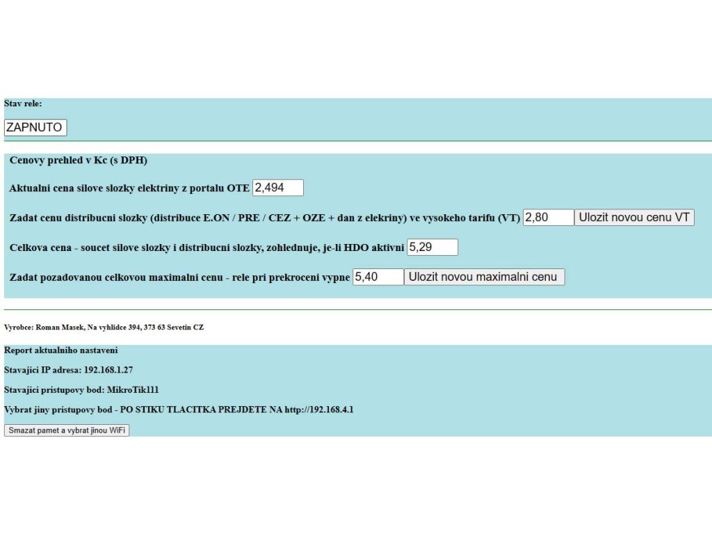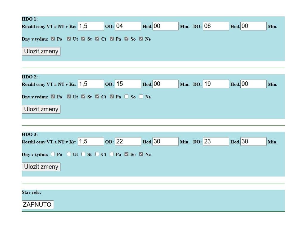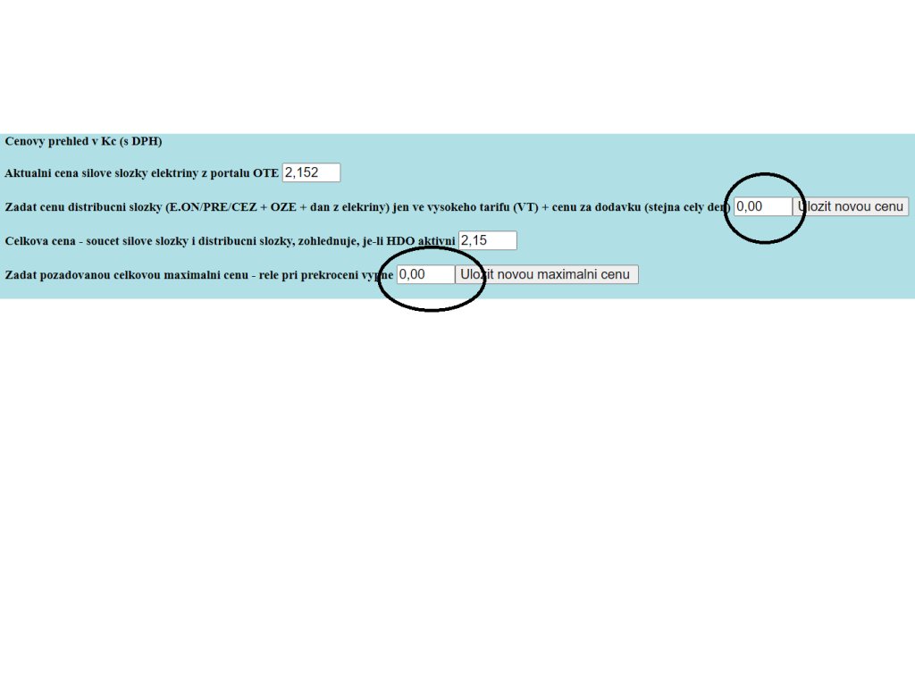 Zařízení pravidelně sleduje aktuální SPOT tržní cenu elektřiny (https://www.ote-cr.cz/cs/kratkodobe-trhy/elektrina/denni-trh) v aktuálním dni a z vybraného intervalu vyhledá hodiny a minuty s nejnižšími cenami komodity. Po celou dobu trvání nejlevnějších cen je relé (230V/10A) sepnuté. Pro očekávanou funkci musíte mít od dodavatele spotový tarif bez fixace, např. Produkt T-Spot - TEDOM energie , nebo NanoGreen.cz. a průběhové měření, které mají automaticky všechny domy s FVE i podnikatelské subjekty. Pokud máte tarif s HDO (všechny tarify kromě D01, D02) časy do nastavení IP relé do sekce HDO1/HDO2/HDO3 Vám poskytne distributor na zavolání na zákaznickou linku, nebo je má na webu. Pro větší proudy, indukční zátěže, nebo 3-fázové soustavy použijte stykač s levnější variantou relé (bez vidlice a zásuvky). Připojení můžeme zajistit my, nebo osoba s odbornou způsobilostí v elektrotechnice.